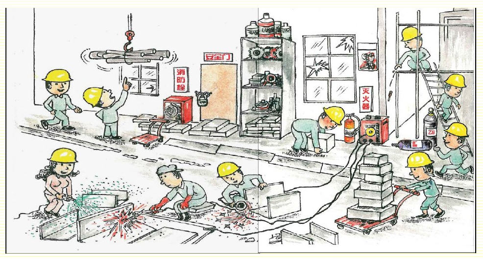 最后,劉群向大家展示了一張漫畫,在漫畫中識(shí)別身邊的違章。一張簡(jiǎn)單的漫畫,卻存在40多處安全隱患,例如電焊線交叉、高空拋物、施工通道被阻塞等等。