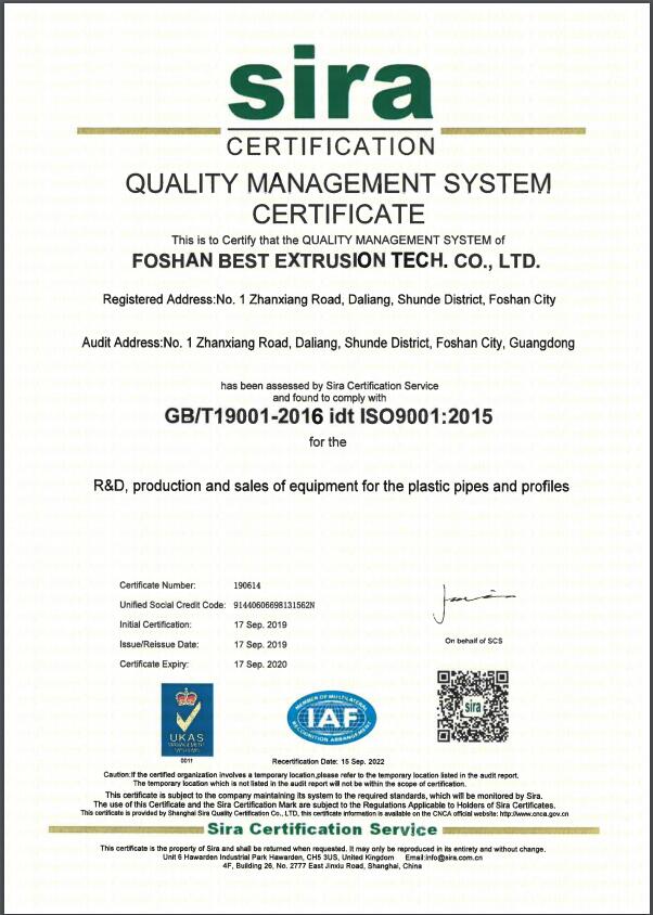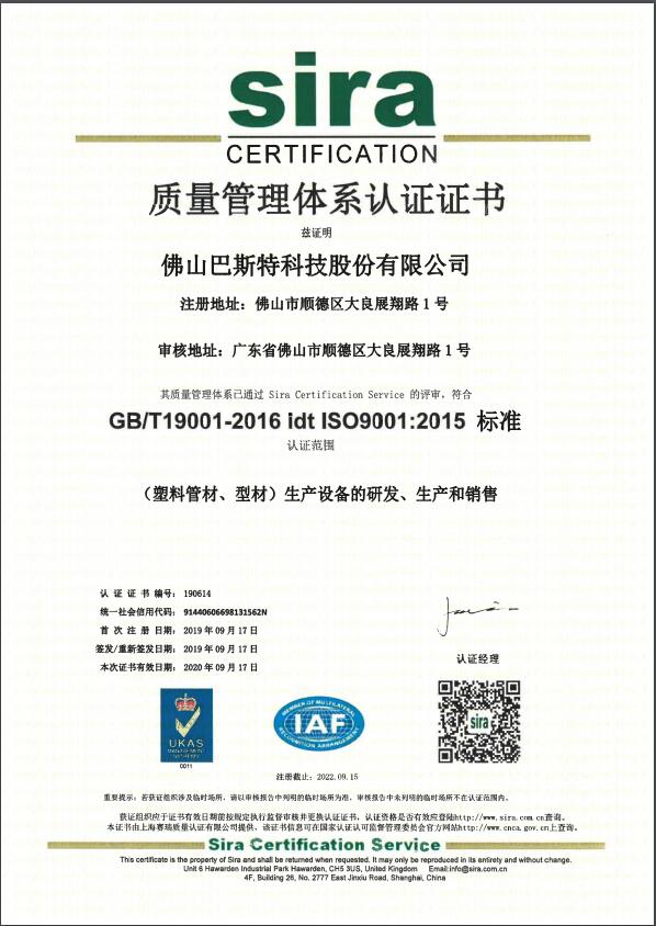熱烈祝賀佛山巴斯特科技股份有限公司通過國家GB/T19001-2016 Idt ISO9001:2015標(biāo)準(zhǔn)質(zhì)量管理體系認(rèn)證!